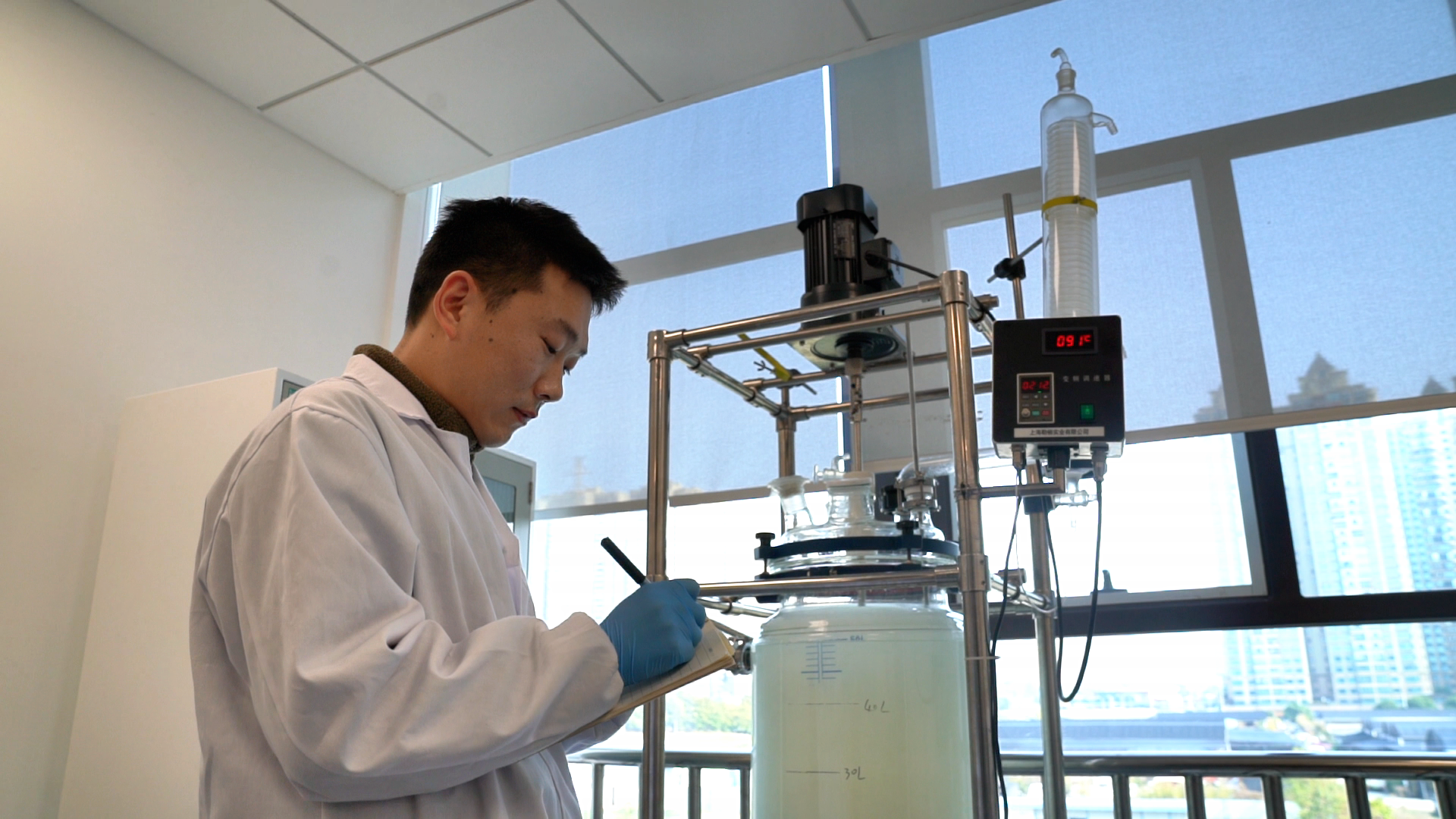 四川中烟技术中心新型材料研究室内,实验员正在记录保润高分子材料反应釜实验数据。